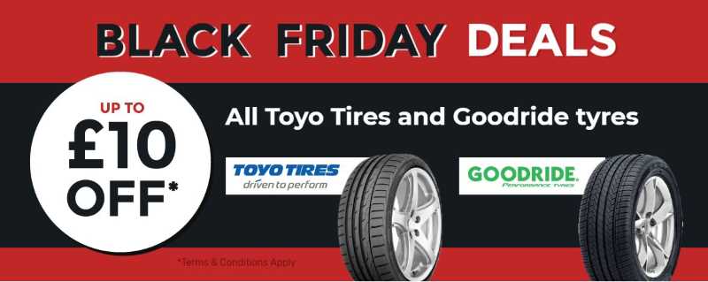 Up to £10 per tyre off on Goodride & Toyo tyres purchased in-store or online.