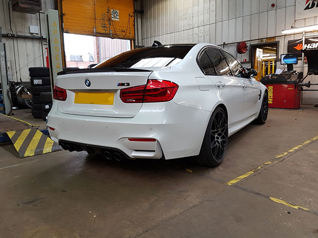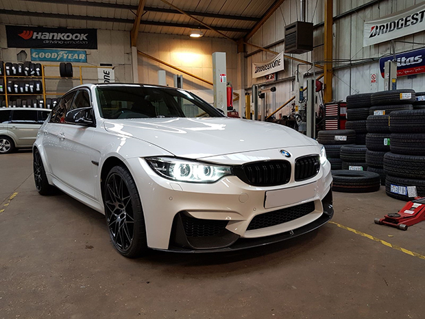 New BMW M3 fitted with competition package having new front 26530ZR20 Michelin Pilot Super Sport * fitted with black wheel weights at our Boston branch.
