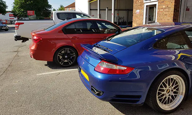 Lovely Sakhir orange BMW M3 in for wheel alignment and alloy wheel refurbishment, and Cobalt Blue Porsche 911 997 Turbo in for Alignment setup at Horncastle depot.