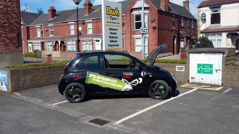 This Nissan Micra that has the Mitsubushi Evo 8 4WD including the 2L turbo engine came into Boston depot for the front and rear toe to be adjusted For more information on our Boston depot please click the link below: http://www.bushtyres.co.uk/store-locator/Boston-4.htm
