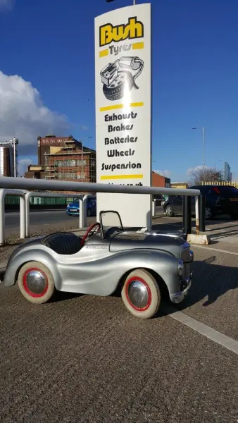 This Humber Page Boy Saloon 1948 Humber pedal car Painted to match larger cars and upholstered in Connellly leather Veneered dash board Wilton Carpets, came into our Hull depot for a tyre check. For more information on our Hull depot please click the link below: http://www.bushtyres.co.uk/store-locator/Hull-Stoneferry-11.htm