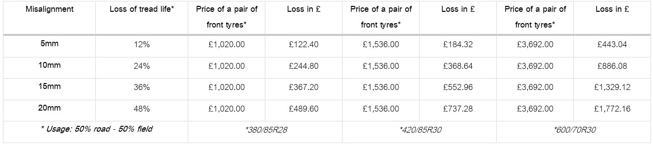 The misalignment of the front wheels of your tractor can seriously affect the life of your tyres, increase fuel consumption, and negatively affect the performance of your tractor. The front wheels of your tractor should be set parallel, with a maximum tolerance of +/- 2mm. If the front wheel alignment is not set correctly the tyres will wear rapidly and unevenly meaning that you will need to replace the tyres much sooner than expected.