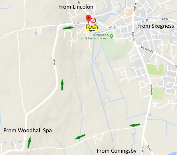 From A158 Lincoln side of Horncastle turn onto the B1190 towards Bardney. Take your first turn left, just before The Durham Ox pub. Follow the road to the ‘T’ junction and turn left. Next ‘T’ junction turn left onto the B1191. Follow the road to the bottom where you will see Bush Tyres on your right.