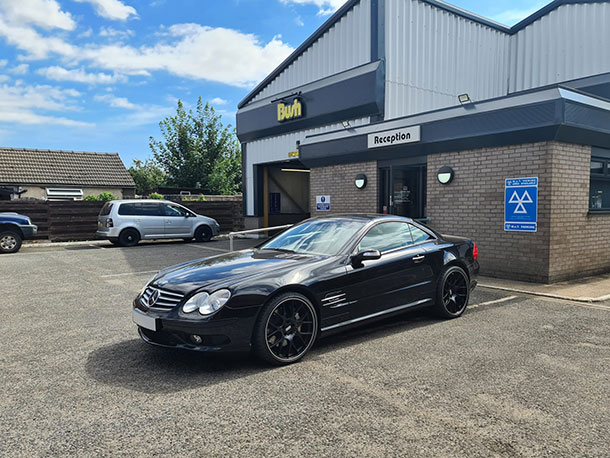 Article written by Bush TyresWe recently had this Mercedes Benz SL600 (R230) V12 bi-turbo in at our Boston branch for an MOT, new Continental SportContact 7 tyres and black TRAX wheel weights.