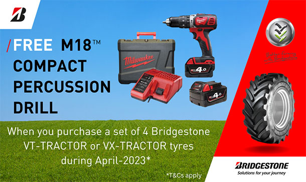 From 1st April – 30th April 2023, Bridgestone are offering a FREE Milwaukee Drill Kit when you purchase a set of 4 Bridgestone Agricultural Tyres. Simply purchase a set of 4 Bridgestone VT-TRACTOR and/or VX-TRACTOR tyres from your local Bush Tyres branch and ask them to submit your invoice, name and address to claim.The offer is available when purchasing a set of four (4) Bridgestone VT-TRACTOR an