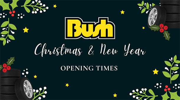 Bush Tyres Group Christmas Opening Times 2022/23Friday 23rd December 8:30am - 5:30pm Christmas Eve 24th December 8:30am - 12:30pm Christmas Day 25th December Closed Boxing Day 26th December Closed Tuesday 27th December Closed Wednesday 28th December 8:30am - 5:30pm Thursday 29th December 8:30am -