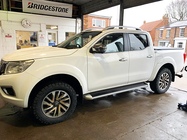 Our Horncastle branch recently fitted a full set of 265/60R18 BFGoodrich All Terrain T/A K02 tyres on this Nissan Navara with demountable caravan.Due to carrying a demountable caravan on the pickup bed, this Nissan Navara was suffering from stability problems. The owner contacted the Horncastle branch to see what could be done to make the vehicle more stable when the caravan was in place.The team at
