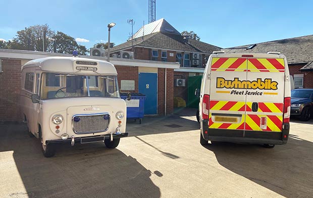The Bush Tyres Norwich team repair puncture on a 1966 Morris L.D.5. ambulance.Bush Tyres Norwich were called out to a slightly unusual puncture repair last week, a front puncture repair on this beautiful 1966 Morris L.D.5. ambulance. This ambulance, formerly used by the City of Norwich Ambulance Service, is believed to be one of the only diesels (Engine 2.2 Diesel) of its type to survive. Named ‘D