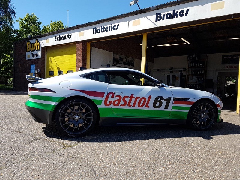 Jaguar F-type Sport 400.Featuring a homage to the XJR9 Le mans racing Jaguars with this Castrol Wrap. In for fitment of Jaguar Lightweight 20" alloy wheels.Black adhesive balance weights used. Work carried out by our Skegness Depot. https://www.bushtyres.co.uk/tyres-in-skegness