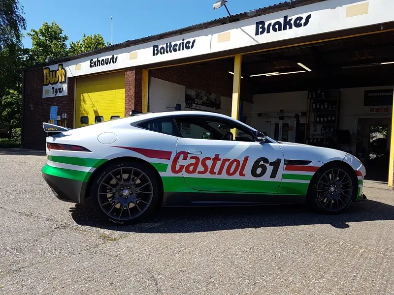 Jaguar F-type Sport 400.Featuring a homage to the XJR9 Le mans racing Jaguars with this Castrol Wrap. In for fitment of Jaguar Lightweight 20" alloy wheels.Black adhesive balance weights used. Work carried out by our Skegness Depot. https://www.bushtyres.co.uk/tyres-in-skegness