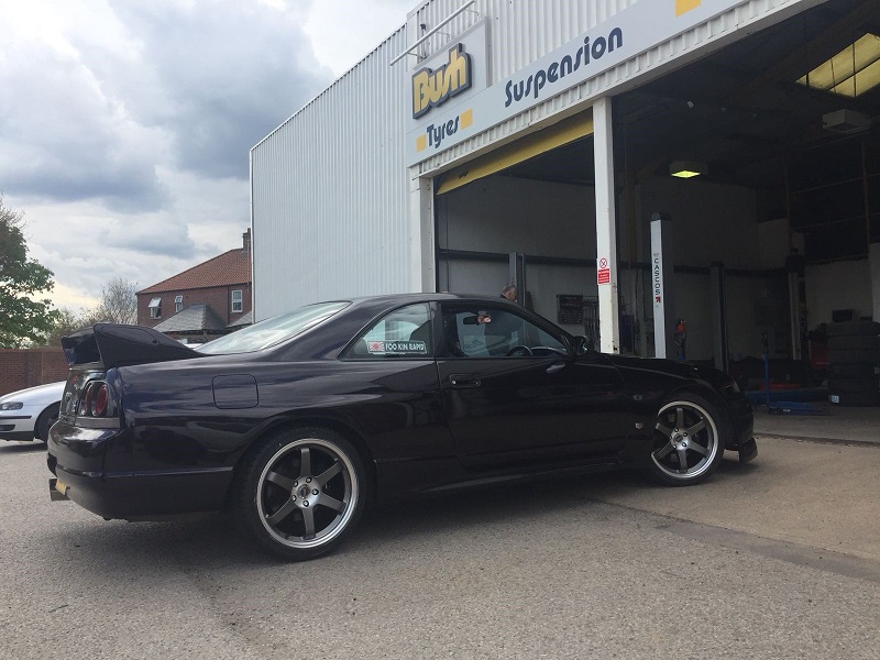 Set of Inovit Asuka Racing ST16 wheels, in Gunmetal with a polished lip in 9.5x18 fitted to this Nissan Skyline R33 GTR. Fitted with black adhesive wheel weights. https://www.bushtyres.co.uk/tyres-in-horncastle