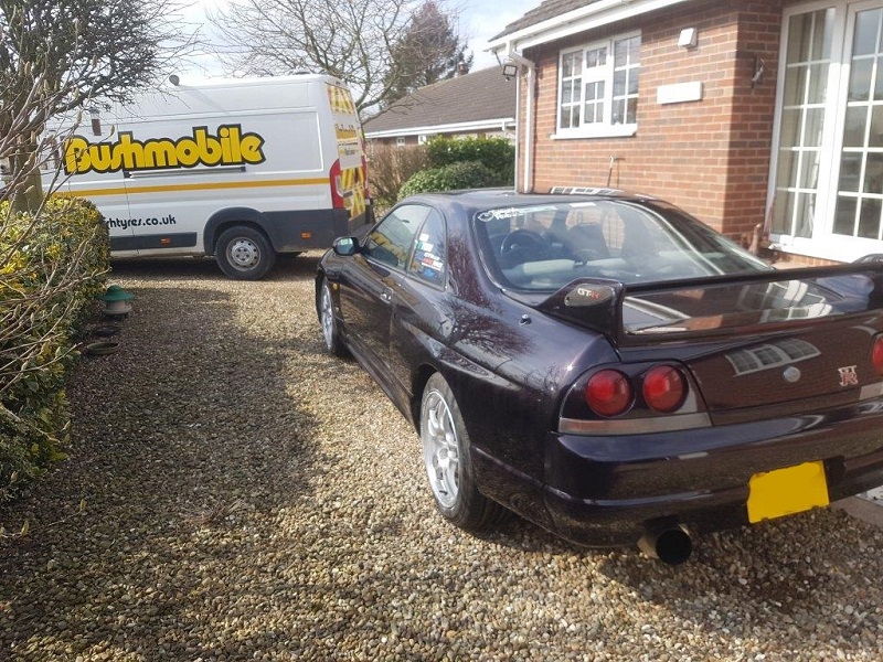 580BHP Midnight Purple Nissan Skyline GTR R33.Belonging to a very happy customer who was stranded when three of his existing tyres failed.Beverley Branch and Serviceline North helped get this customer back on the road by fitting a full set of 24545ZR17 99Y XL Toyo Proxes Sport'S.Fitted at the customers home by Service line North - Mobile Car Fit Van. https://www.bushtyres.co.uk/tyres-in-be