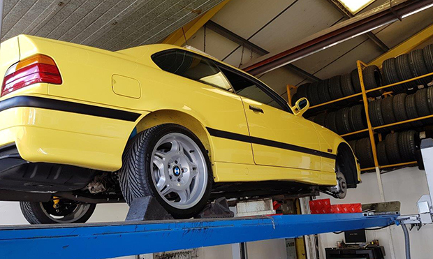 BMW E36 3.0 M3Continued restoration work on this BMW E36 3.0 M3 in Dakar Yellow, working with Corten Miller Performance centre, Zircotec Coatings on original manifold and all the way through to the new supersprint race rear exhaust, Bilstein dampers fitted new heat shields, brakes reconditioned, lots of parts painted and powder coated.Now at our Bush Tyres Horncastle branch having Track rod ends and