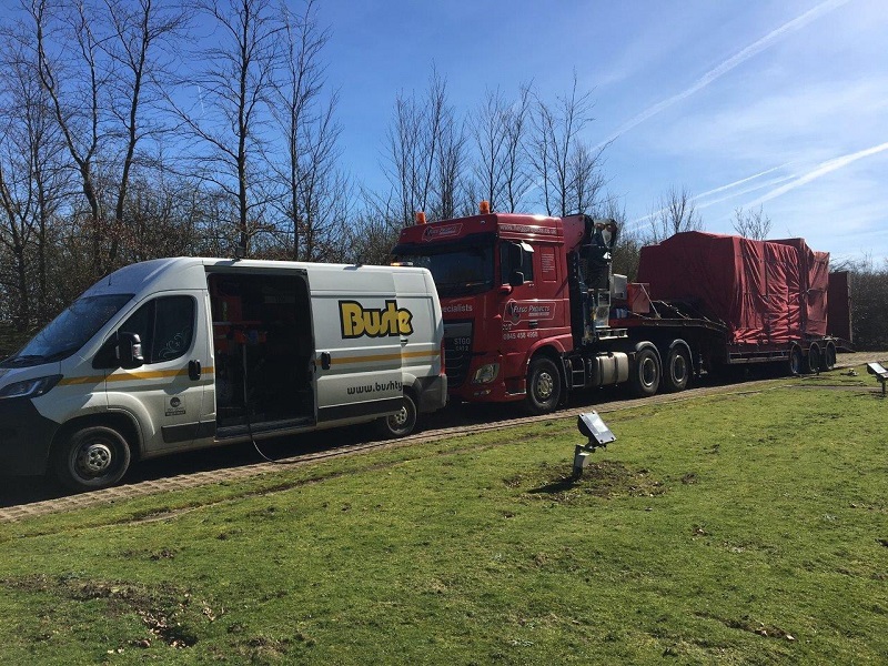 Heavy Machine Low LoaderThis Heavy Machine Low Loader, carrying 42 tonnes, came off the road and bent a wheel. Our Louth depot fitted and new wheel and tyre, also carrying out a 30 minute re-torque.
