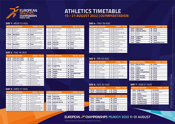 From 15 to 21 August, the various athletics disciplines will be held in the Olympiastadion and in the city centre of Munich. Starting with the marathon on 15 August and ending with the final of the men’s and women’s 4x100m relays on 21 August, European Athletics offers an exciting programme.