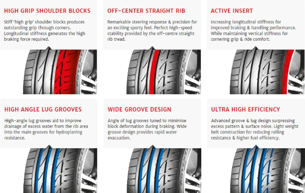 The key features of the Bridgestone Potenza S001 are its asymetrical tread pattern & innovative construction that guarantees new levels of handling & performance.