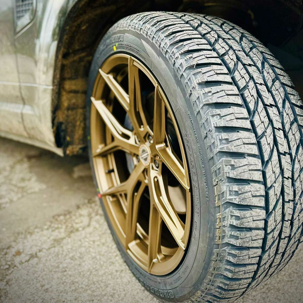 The Yokohama GO15 All Terrain “AT” tyres are fitted here in the extra wide 28545R22 front and rear. The Geolander is the All-Terrain tyre from Yokohama, built for Crossover SUVs, 4x4s and is suitable for many AWD pickup trucks or crew cabs, or even camper vans.